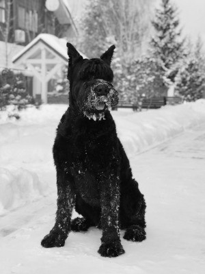 Очень древняя сука цвергшнауцера в ужасном состоянии была найдена на улицах Таганрога в октябре 2022. Оказалась давней знакомой Фонда, которую уже не раз находили на улице. Но в этот раз контакты владельцев найти не смогли, а на объявления о находке никто не откликнулся. Бубуся комфортно прожила почти два года в компании ризеншнауцеров, считая себя атаманшей банды и охраняя большое подсобное хозяйство, попутно дегустируя весь урожай.