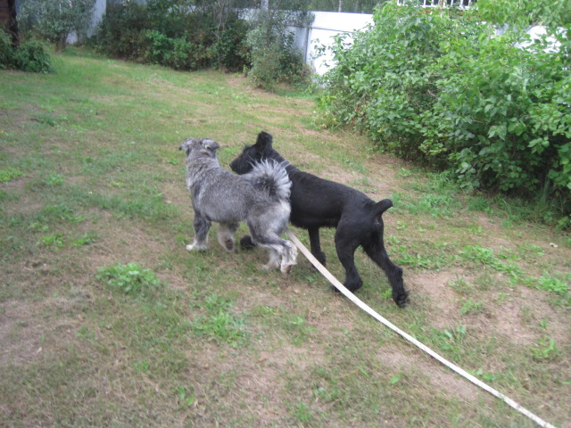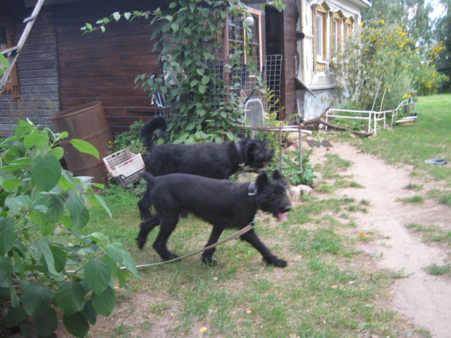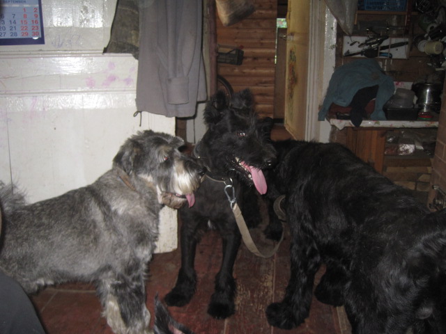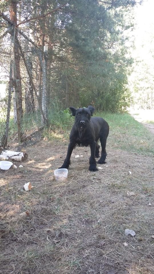 Сегодня Ира (zver) и Ольга (olga joker) выловили товарища-монстра. При ближайшем рассмотрении оказался кобелёныш около года или чуть больше. Лает на людей, потому что их боится - видно, что ему доставалось от них. Если видит, что гнать палкой и кидать камнем не собираются, то дает и гладится, и на поводок пристегнуть, и на поводке ходит нормально. В машине ездил, так что в дороге вел себя прилежно (хотел жениться на Ириной Мире, которую взяли в качестве приманки). О том, ризен ли это, можно поспорить. Скорее, метис. Точнее, точно метис. Хотя, когда был щенком, его наверняка продавали как ризена - иначе зачем купировать собаку. Ростом он пониже суки ризена.