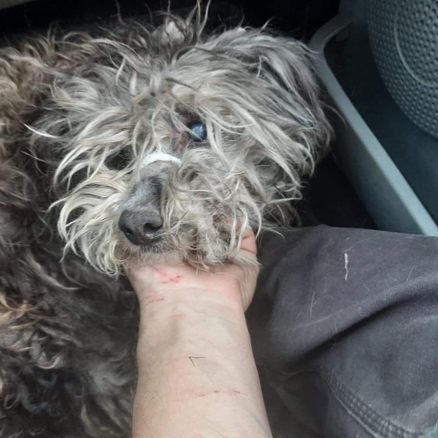 Заросший, грязный, облепленный клещами цверг в начале мая прибился во двор многоэтажки, жил в куче строительного мусора, куда прятался от любого шума, и рыскал по мусоркам в поисках еды. Долго не могли забрать его с улицы – не было передержки и элементарно людей, которые могли бы поймать собаку. Сеня не подпускал к себе ближе, чем на 2 метра, поймать его со второй попытки смогли только профессиональные ловцы из команды харьковских зооспасателей.