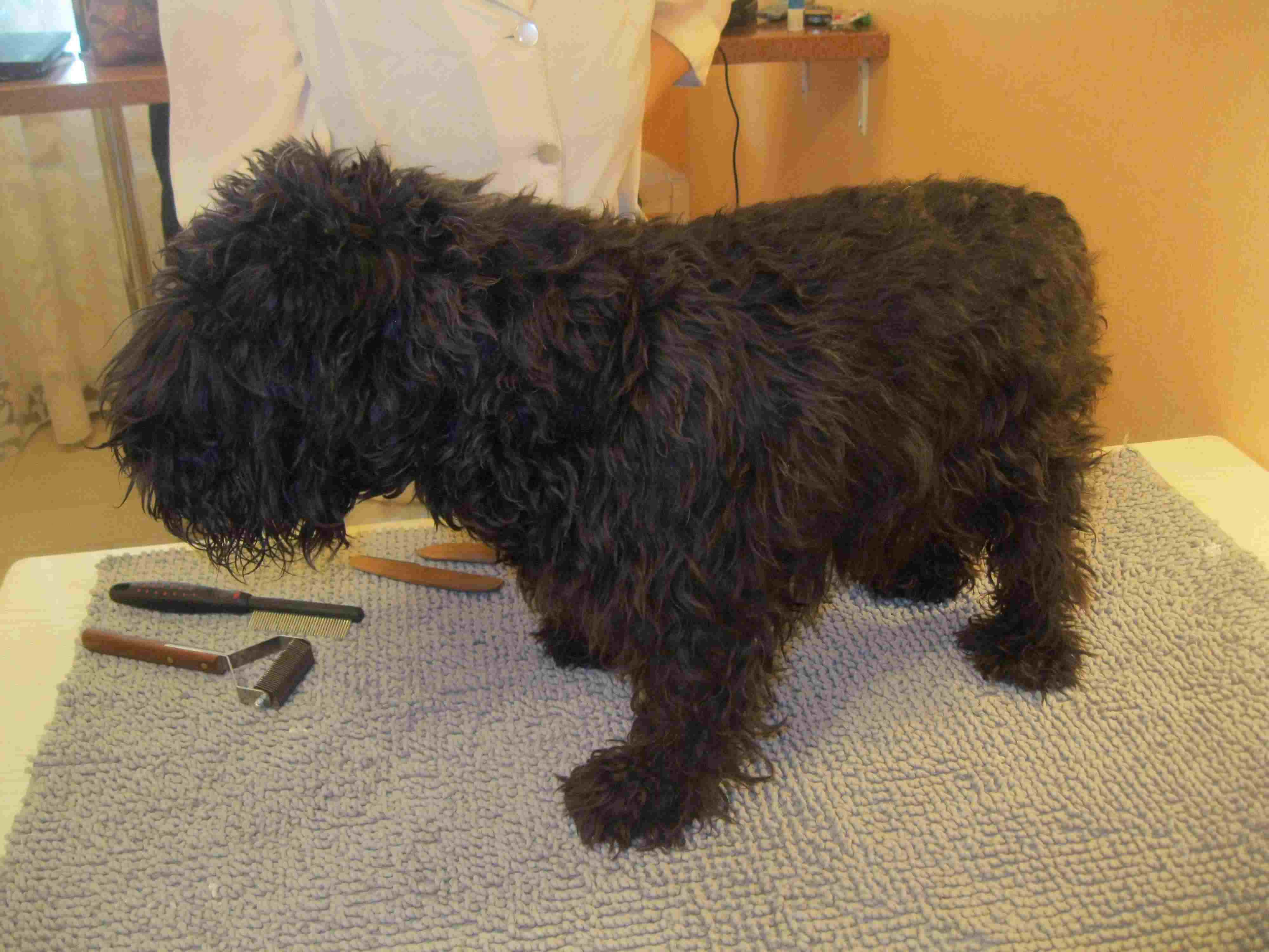 Мы сделали тримминг, а то он совсем оброс как медведь. Я надеялась, что погода наладится, но нет. И мы зиму гуляли голышом, сейчас в попонке.