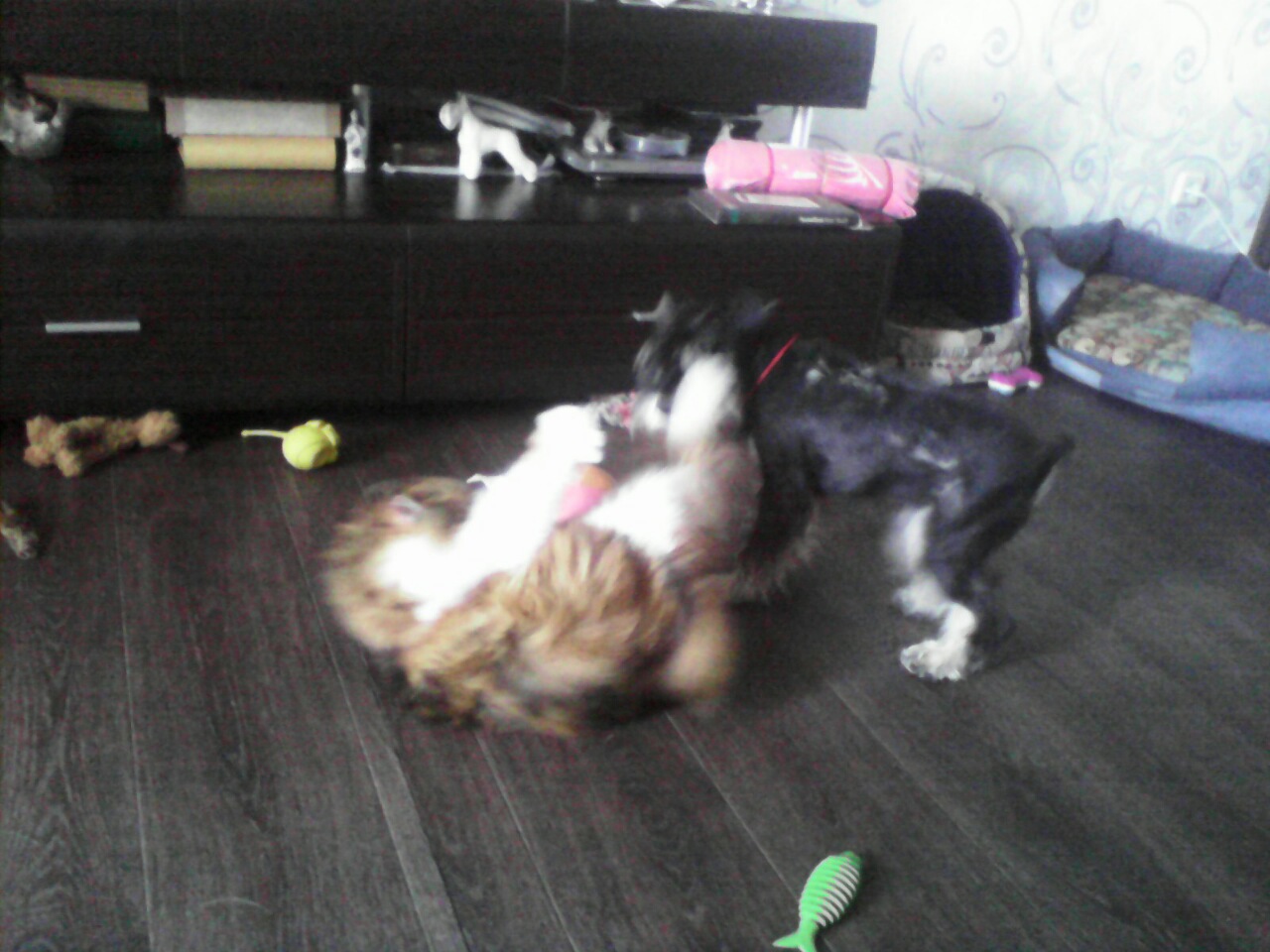 Юлик ее подлавливает, когда Нюшка лежит наполу, наваливается сверху и с упоением треплет по всему корпусу, кусает уши. Та терпит очень долго, лапами начинает махать без когтей, когда уже совсем заедает. Юлик тогда начинает возмущенно лаять, что игрушка сопротивляется :-)