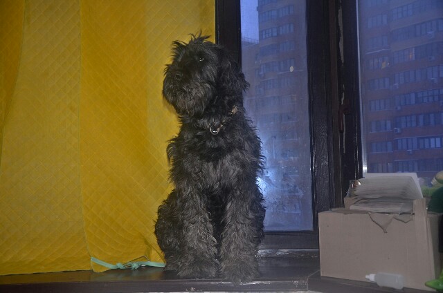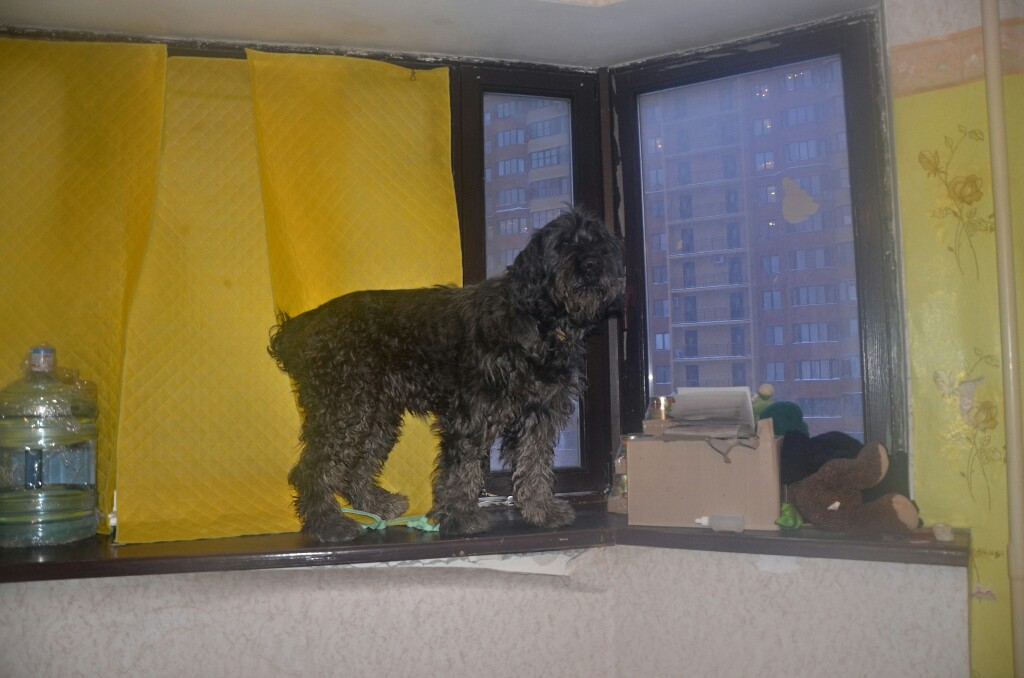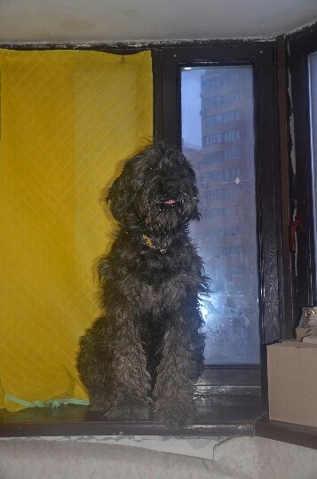 Сейчас Ольга приходит с работы и открывает большую комнату, а собаки нет..... Эта дурында забралась на подоконник ( у он у неё очень высокий, широкий и длинный, соединяет несколько окон), а слезть боится!