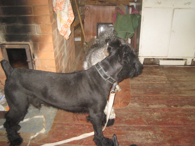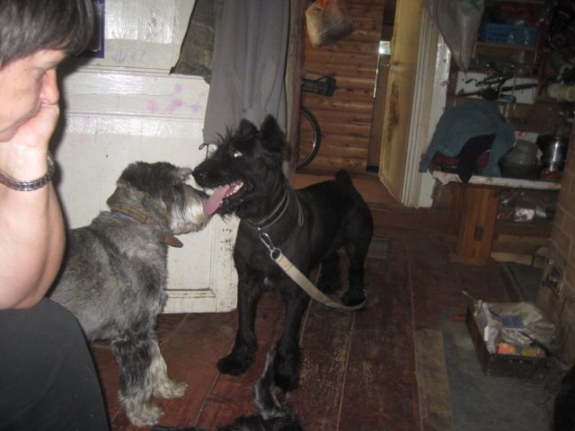 Сегодня Ира (zver) и Ольга (olga joker) выловили товарища-монстра. При ближайшем рассмотрении оказался кобелёныш около года или чуть больше. Лает на людей, потому что их боится - видно, что ему доставалось от них. Если видит, что гнать палкой и кидать камнем не собираются, то дает и гладится, и на поводок пристегнуть, и на поводке ходит нормально. В машине ездил, так что в дороге вел себя прилежно (хотел жениться на Ириной Мире, которую взяли в качестве приманки). О том, ризен ли это, можно поспорить. Скорее, метис. Точнее, точно метис. Хотя, когда был щенком, его наверняка продавали как ризена - иначе зачем купировать собаку. Ростом он пониже суки ризена.