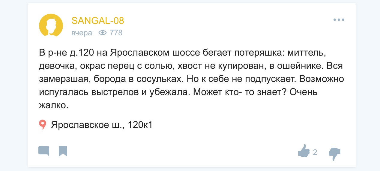 Звонит Олев. Они сегодня снова прочесывали местность, встретили очевидцев, которые видели собаку сегодня в районе 16 часов у Пятерочки в торце дома №142 по Ярославке.