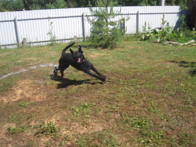 Вот мы однажды гуляли,а в одном месте у нас "умные" люди кусок берега в бетон закатали, ни травы ни песка-бетон. Мы пришли -волны слушаем,а они там по другому поют, более резко что ли... Фира робеет, всё не так... и тут я камушек в реку кидаю.....Оставив без раздумий все свои страхи на берегу, Фира ринулась в воду.....вода же))))