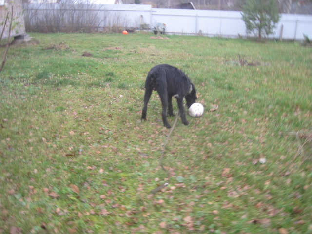 По совету Ирины Владимировны, знакомить стали не со всей стаей сразу , а по очереди))) Первым в очереди оказался Тёма. Мы прошлись кружочек по сопредельной территории и вернулись на наш участок. Лукаш особого интереса не проявил,но остался спокоен,а Тёма (!!!) предложил ему поиграть!!! Но ,увы,гостю сейчас не до игр(((( Он худ( Освенцим), очень высок,и пока,видимо, обеспокоен только -едой,водой и теплом... Попил,как Тёма-из всех мисок что были...Тёма ,кстати,был не против.....и всё могло бы получиться если бы....
