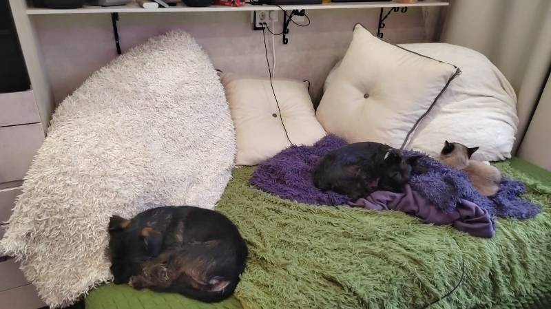 Сплю, как Тай, только у него выбор и пространство, как и у Бьнки и кота.