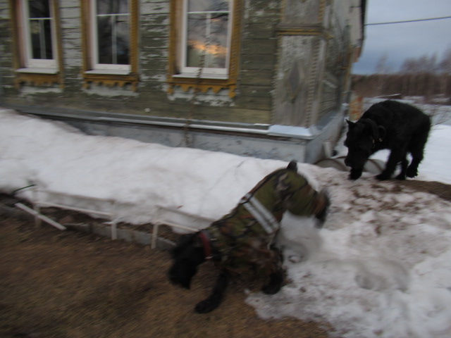 Утро.) Готовимся идти на прогулку. Хожу по участку- то птичек покормить, то снег на дорожку упал-убрать надо.... Данька носится по участку) (а у меня новенький фотик, и я как ребёнок таскаю любимую игруху везде с собой и играю-играю)))))И тут Данька несётся прямо на меня, с ходу садится в ногах и прячет морду мне в куртку..) Глажу по голове)) Данька высовывает морду, оглядывается и снова прячет морду ....не понимаю... оглядываюсь- рядом вьётся Шкипер ,раздувшийся и виляющий всем самим собой, как угорь )))) :yahoo: