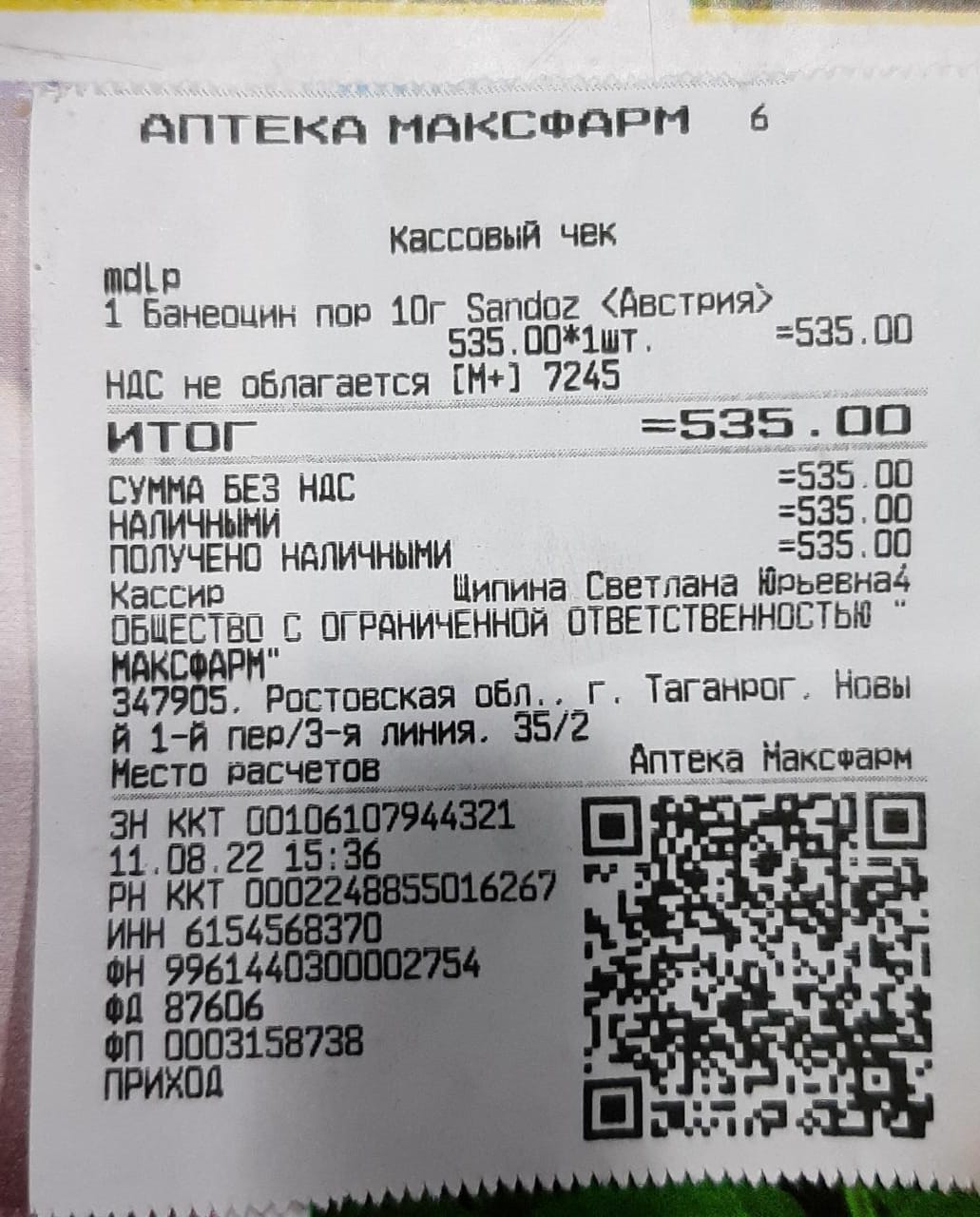 - 535 рублей Банеоцин для Хана.