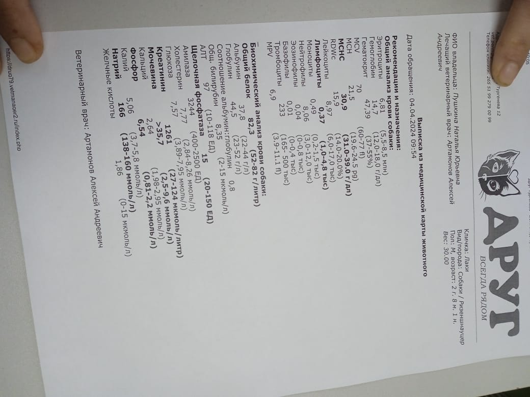 Ирина Владимировна, здравствуйте! Лаки заболел, отказ от корма, рвота была. Направляю анализы, посмотрите, пожалуйста. Назначили Гептрал или самеликс в/м или в/в. Побежали покупать
