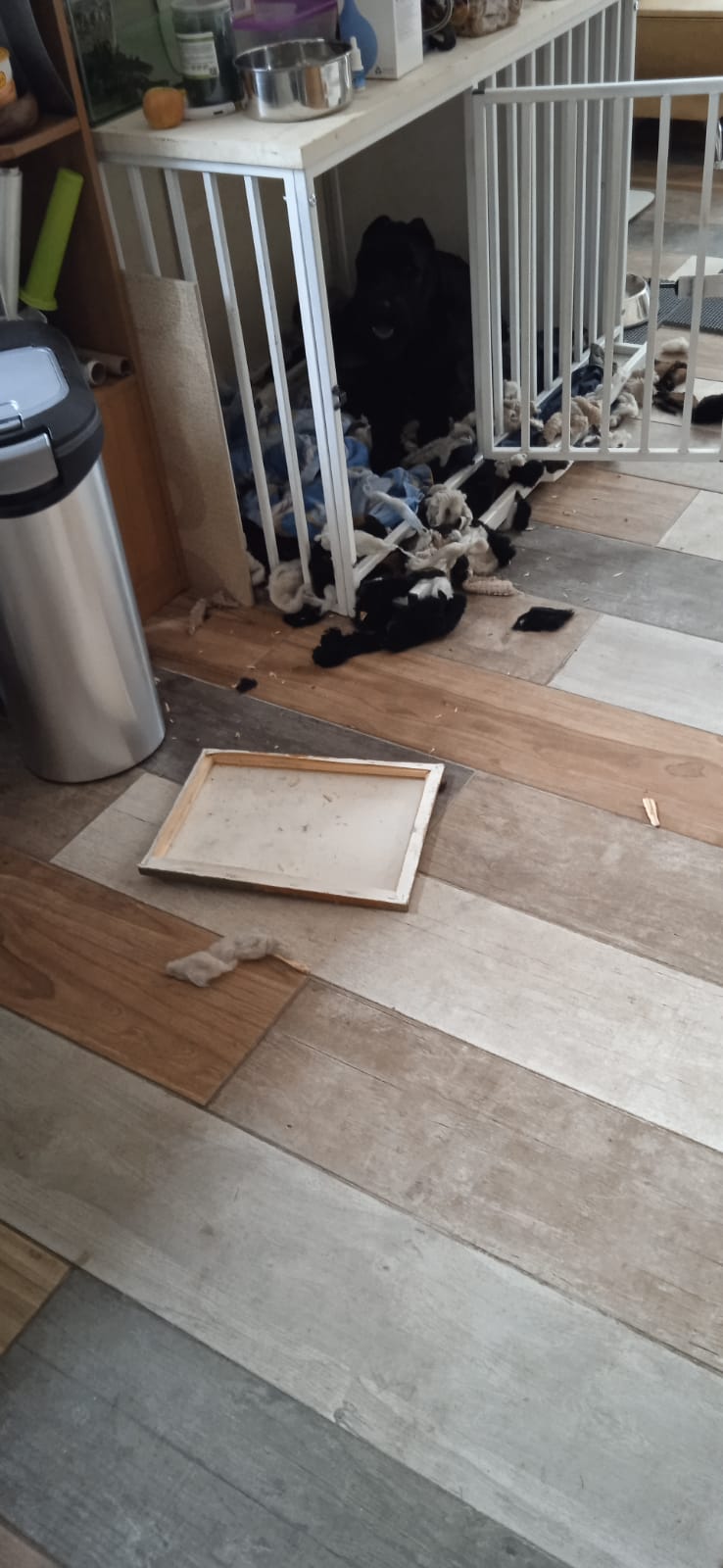 В мой очередной отъезд на работу случился очередной погром. Проводы и встреча сопровождалась лаем. Поддон умудрился сдвинуть. Поцарапал палец на правой лапе. было разодрано все, что можно. Сгрызено полено. Предполагаю, что на фоне постоянного лая и истерики, товарища еще и стошнило, видимо сыграло роль еще и то, что опилки Ник частично сожрал.