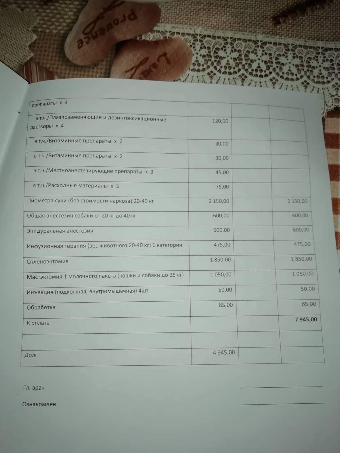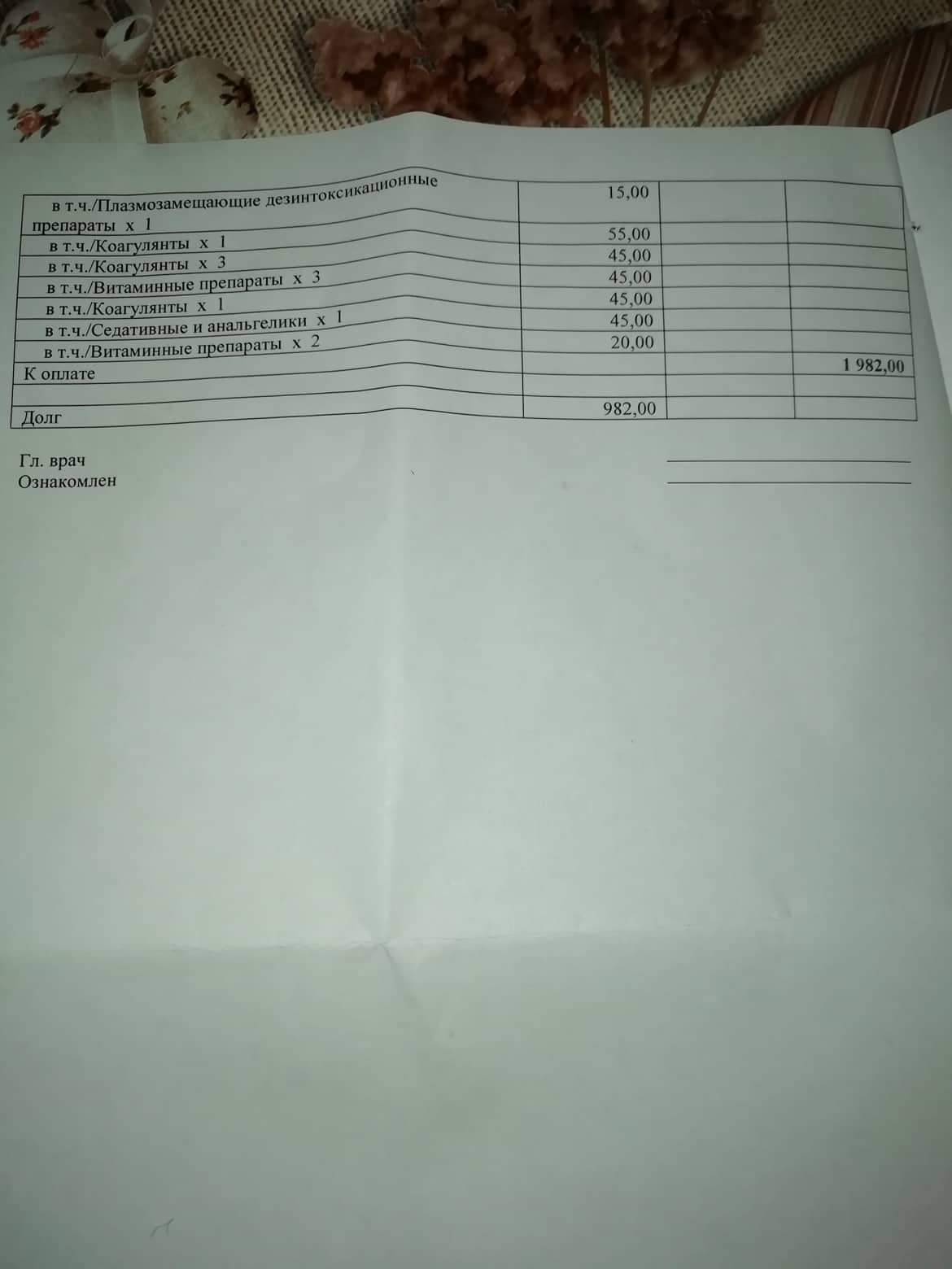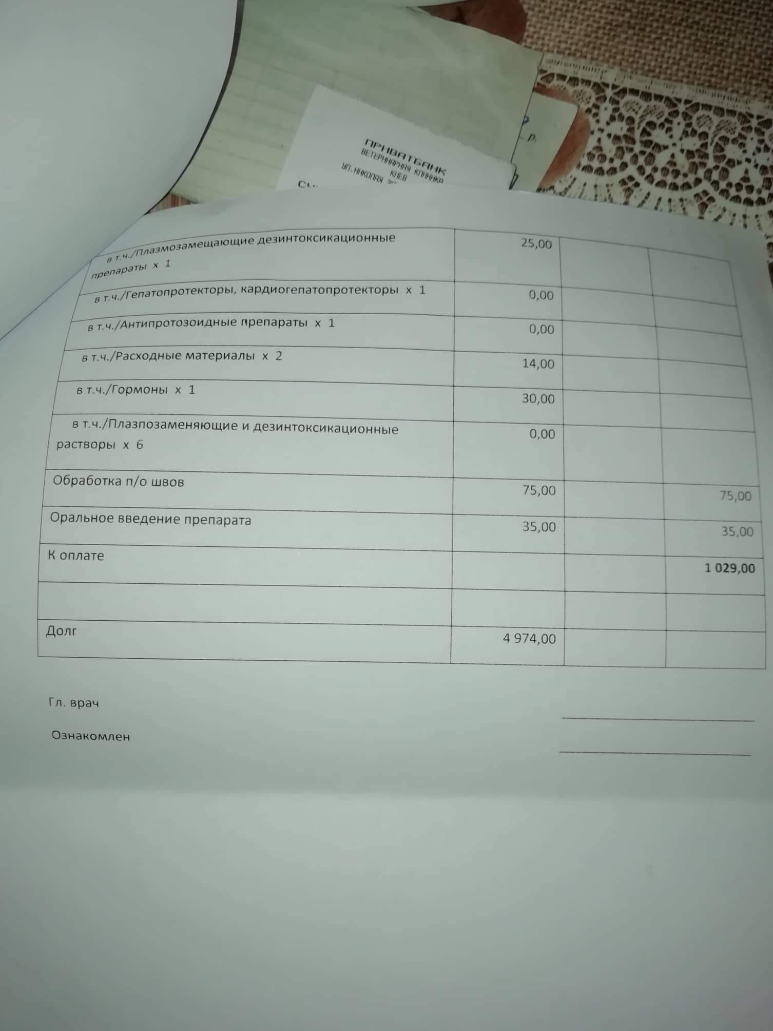 Цитата: "Сегодняшний счёт за стационар. Он оплачен ФПШ. Долг остался примерно тот же. Лекарства некоторые покупаем сами, доктора посоветовали, так как в клинике они с накруткой. Лекарства примерно 400 грн в день: омепразол, метронидазол, гептрал и рингер лактат. Ну плюс физраствор."