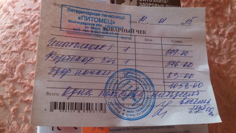 484 (прием врача, новокаиновая блокада, отибиовет, лактобифадол и от глистов, не могу на чеке прочитать). 06.01.2015