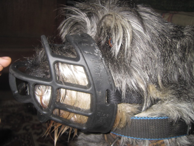 Застёгнутый на последнюю дырочку-не снимается-вторая фотка я специально оттянула намордас....(.до половины морды и не дальше-значит не снимет))), но выглядит немного громоздко(третья фотка)хотя борода не помялась)))