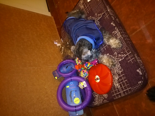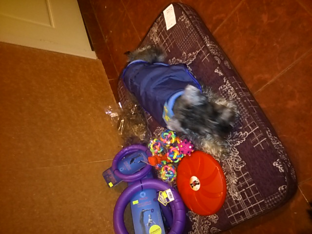 Лежаки, миски со стойкой, игрушки, попону для Бима купили. Позже выложу фото. Вкусняшки дорогие и брать сиысла не было. Купила легкое( большое) для Полли, остальным мелким подходящего ничего не было.