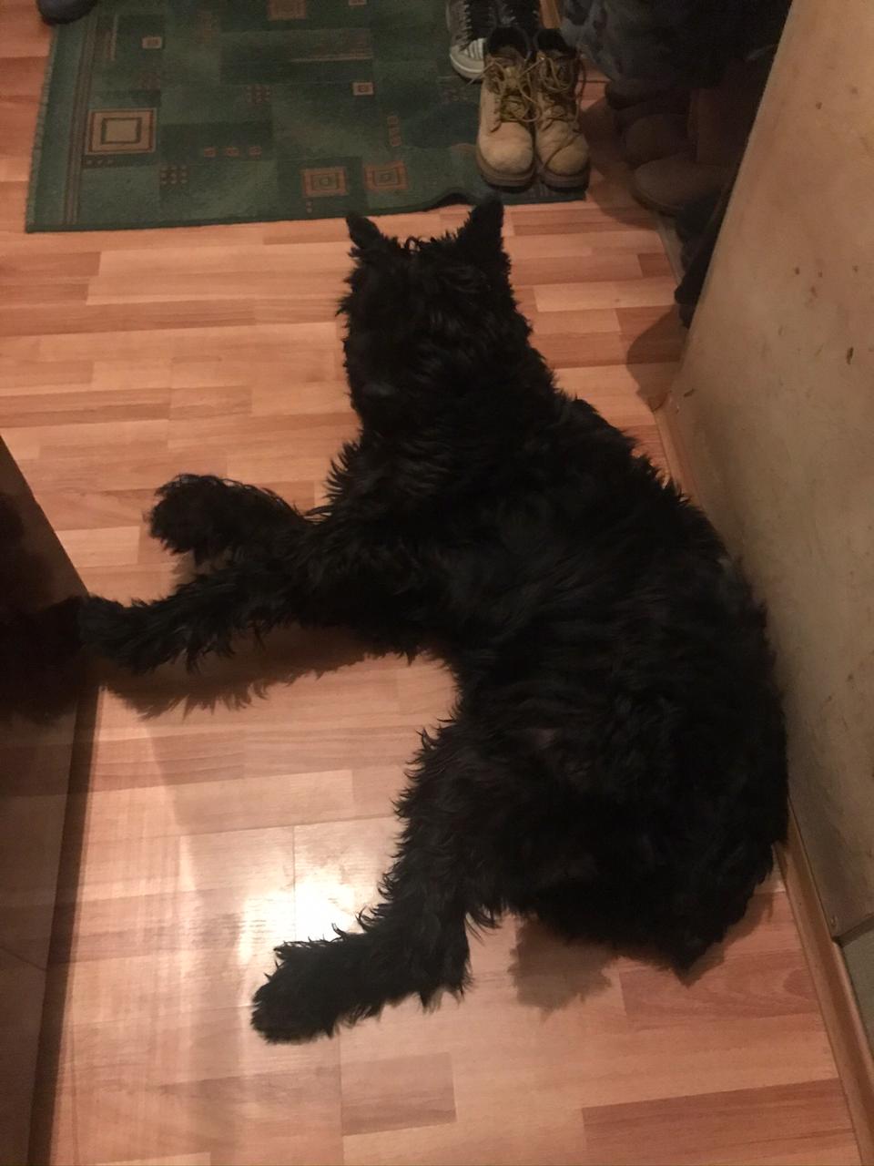 Если не находит никого из них, то тогда уже ложится на тапок и охраняет его