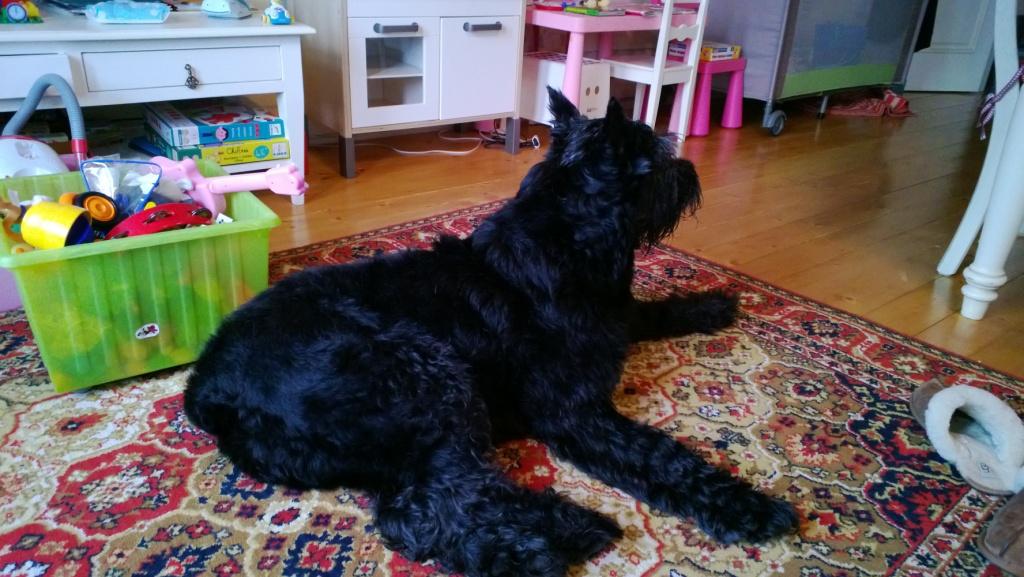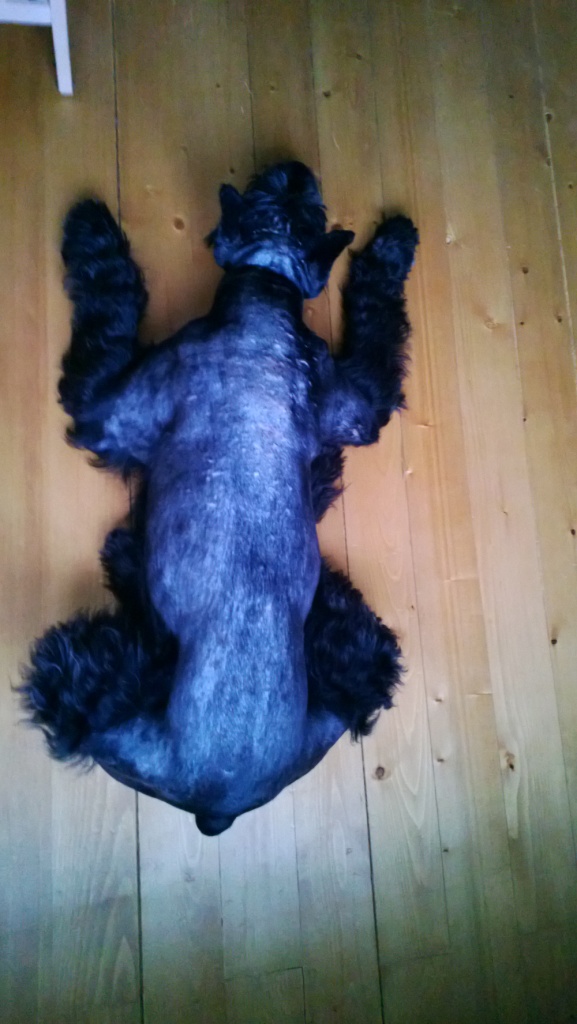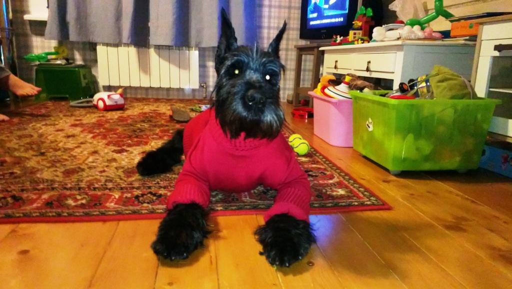 Майка оттримингована! Чудо, а не собака - вела себя изумительно, даже тогда, когда я выдергивала новый слой шерсти, образовавшийся под старым, и ей явно было несколько больно. А во время щипки боков - ложилась и спала, не забывая при этом поднять одну лапу, чтоб чесали живот. Так и щипали бока - одной рукой щипала, второй - пузо гладила. После тримминга стала совсем красавица - настоящий, полноценный, крепкий, добротный ризеншнауцер!