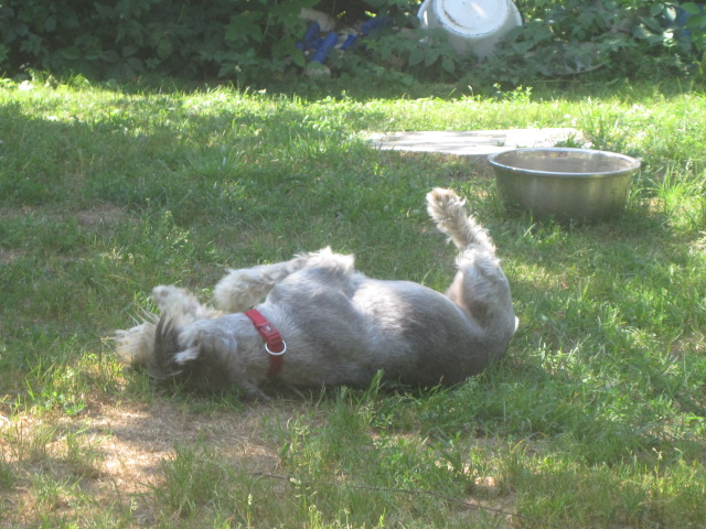 Приятно удивила на прогулке- девочка плавает!!))) Не просто -не тонет и не паникует, нет- плавает, безстрашно и с удовольствием!! Плавала с Тёмой на перегонки за палкой и отнимала у него палку там, где и Тёма до дна лапами не достаёт!!))) Очень любит поваляться на травке!!!