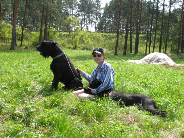 Доброй ночи от Норда и Лен. области. Если позволите расскажу о нашей загородной жизни. Не перестаем удивляться насколько Норд влился в семью, он действительно наш. Смотрю, бывает, на него и становится тревожно, как мы жили без него. Места хватает всем, с кошками ладит отлично, но без ласки. Привезла цыплят, так они порхают у его моды и промеж ног, так ни грамма недовольства. Пренебрежение по отношению ко мне прошло, слушается одинаково и меня и Дениса. Зато ризенша решила, что одной хозяйки ей хватит, то сбежит от Дениса, то пренебрегает его требованиями. Решили что требуется промывка мозгов и прогулки на поводке. Помогает. Картина "Репина" - иду по дорожке, а впереди две очаровательные черные попы шагают нога в ногу. Наблюдая его вливание в коллектив, приходит на ум сравнение с ребенком из детдома. Требует, иногда, излишнего внимания к себе (поймите правильно), команд слушается, но только с криком. Иногда напрягает делать строгий голос и звать домой. Он же раньше норовил сбежать и один бродить по хутору. Теперь знает куда можно, а куда не надо. Парень он не компанейский, спокоен и строг. Теперь не убегает, если пошли гулять, и плавает, постоянно плавает. Если не догулял в лесу, то наплавает в пруду. Если плаваешь рядом с ним, то он спокоен, не пытается утопить, ризенша пытаясь спасти, норовит утопить. Немножко расскажем о нашем внешнем виде, мы стрижемся. Первый раз это был смертельный номер, пришлось буквально убалтывать, говорить какой будет красивый и тому подобное. Второй раз стригся хорошо. Стоял спокойно, не переживал и потом, я стригу быстро, чтобы не надоесть. У нас очень жарко, и двор выходит на солнечную сторону. Собаки ухожены, не люблю летом медведей.