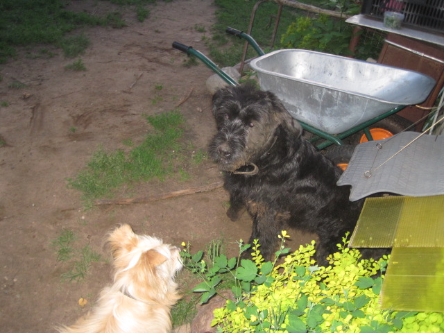Ну и доигрался- поливаю цветочки из шланга-Генка за струёй бегает -охотится....и Тёма,как без него-то поливать.. один аккуратненько играет, второй как лось во время гона...