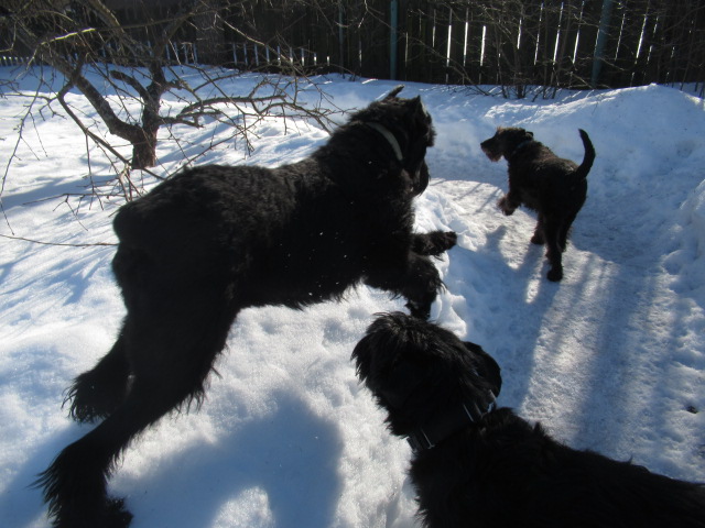 Появились стаи весенних,очень весёлых и слегка шалых, собак))) Собаки летаю(!!!) по участку и верещат от радости и солнца!)) Эти радостные зверики торопят весну .откусывая на лету\бегу от каждого сугроба))И уже начали садовые работы ,обгрызая "лишние" ветки с деревьев и кустов.