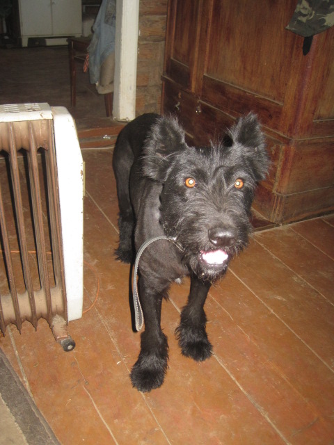 Сегодня Ира (zver) и Ольга (olga joker) выловили товарища-монстра. При ближайшем рассмотрении оказался кобелёныш около года или чуть больше. Лает на людей, потому что их боится - видно, что ему доставалось от них. Если видит, что гнать палкой и кидать камнем не собираются, то дает и гладится, и на поводок пристегнуть, и на поводке ходит нормально. В машине ездил, так что в дороге вел себя прилежно (хотел жениться на Ириной Мире, которую взяли в качестве приманки). О том, ризен ли это, можно поспорить. Скорее, метис. Точнее, точно метис. Хотя, когда был щенком, его наверняка продавали как ризена - иначе зачем купировать собаку. Ростом он пониже суки ризена.