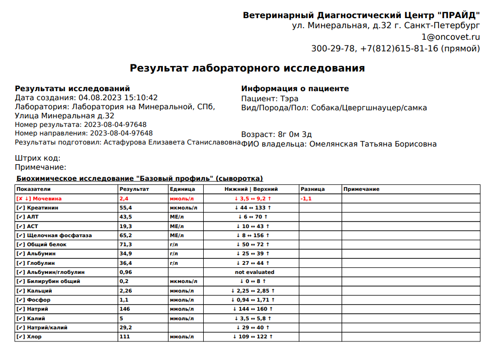 Спасибо, что приютили. От клеща надо обработать повторно 26.08., остальные назначения выполнены. кроме лапы мыть шампунем и уши протирать лосьоном.