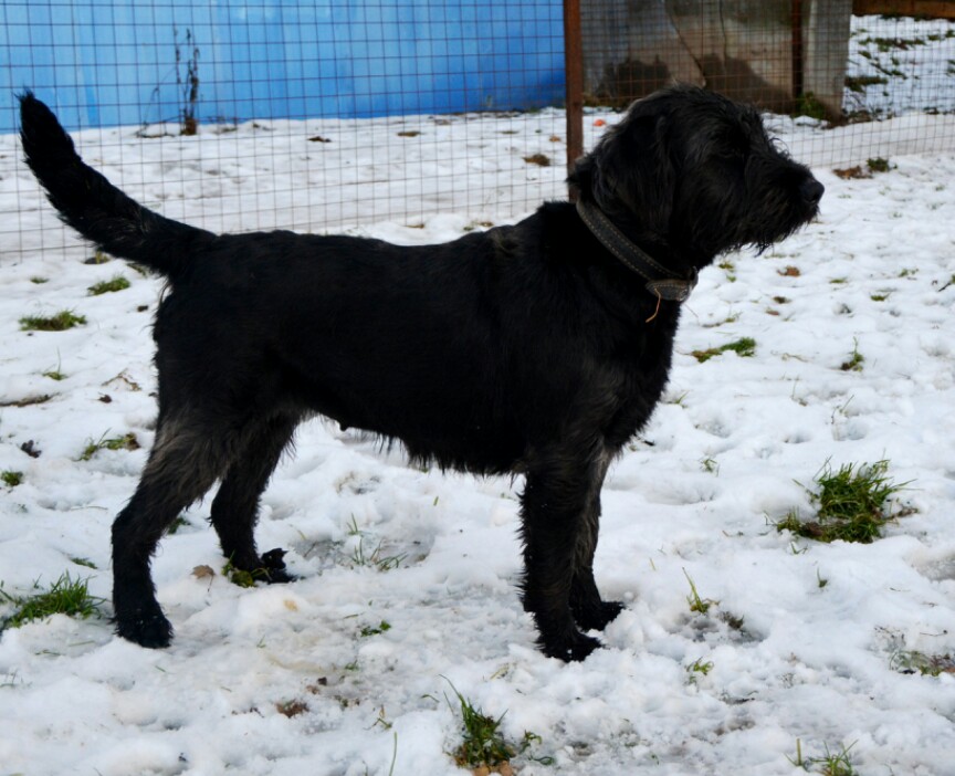 Молой ( ее щен) около 6 мес., будет я,думаю с ризена. Длиннолапый , с оброслостью, хвост длиннее, чем у мамы и тоже саблей. Только уши, меньше размером, чем у наших. Короче так. Нас провели по территории приюта, показали все. Все забито под завязку. Мадам не вытянутая. Не конфликтная. Если малому 6 мес., то она болтыхается около года. По спине шерсть волнистая, уже щипать нужно. Но мохнатость, не такая как у наших. Может и подстригали, т.к. Морда все же не лысая.