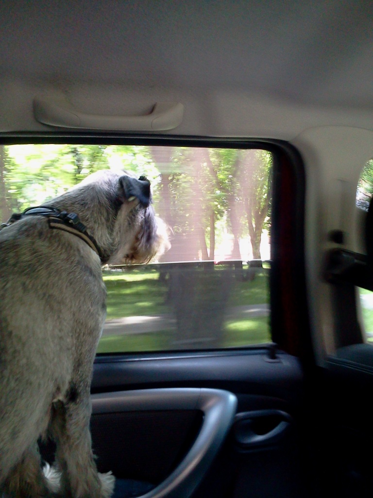Еще Фил освоил азы поездок на машине- высунь нос в окно называется. А так же понял, что в багажнике у него понимаете ли места то больше, чем на заднем сидении. Но там не так интересно. Вот и скачет туда сюда.