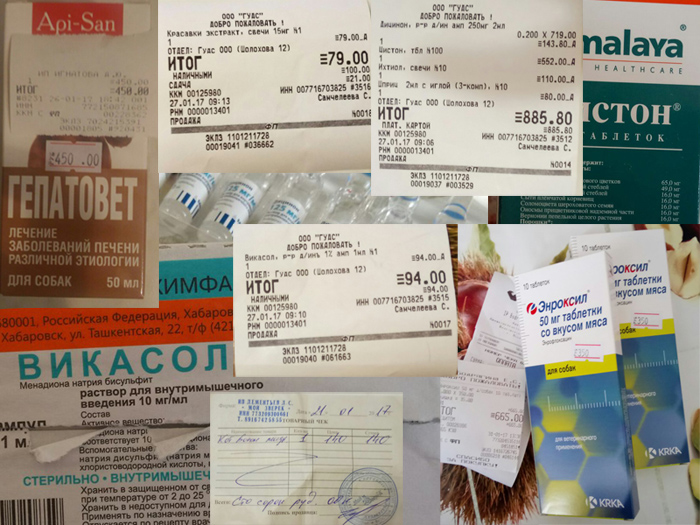 Лекарства: Гепатовет 450+свечи 79+дицинон, цистон, ихтиоловые свечи, шприцы 885,80+викасол 94, кот баюн 140+энроксил 2 уп. 665.