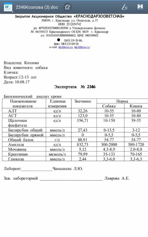 Значит предистория.Жеса отказалась от корма позавчера .Несмотря на это гуляла ,как обычно. Хозяйка гостиницы позвонила мне и врачу ,который обслуживает эту гостиницу. Врач взял анализ крови.Сегодня результат прислали мне на почту .Сам врач будет завтра и будет делать назначения. Вчера Жеса ела хорошо ,сегодня пол-порции. Из того что заметили девочки -служащие и сама хозяйка: Жеса как бы подкашливает ,при этом может отойти некоторое содержимое.