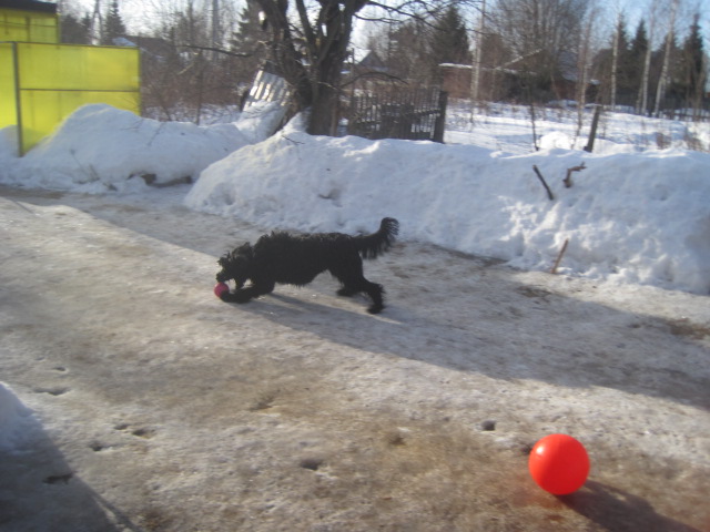 У нас появилось два новых мяча....Тёма пытается играть обоими)))жадюля))))Всё остальные, включая меня,хитростью или обманом,отбираем один и играем в футбол (Генка правда предпочитает палки) А Тёма то держа один мячик зубами пытается лечь на второй, то прячет один в сугробе и бежит отнимать мячик у нас.....а два-то сразу не взять мячики большие.....