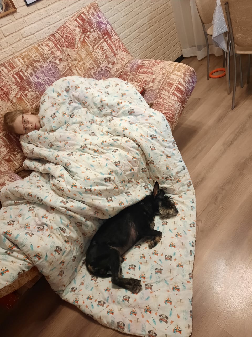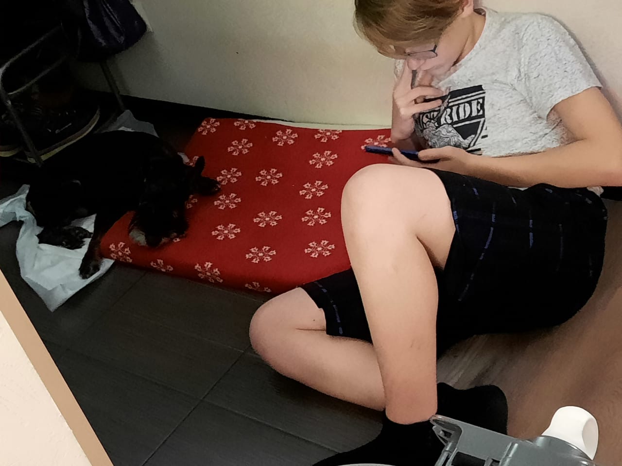А вот "старая" фоточка, здесь первый вечер у нас после приезда - 28 декабря, Бэр тогда еще совсем не гулял по квартире, опасался наверное, он ходил только на кухню кушать, ласкаться к нам около дивана в зале и потом снова на эту перинку (мы её здесь положили, потому что он именно на это место лег по прибытию, прям на плитку), Данил решил вопрос осваивания с Бэром таким вот образом - сидеть тогда с ним около него на этой перинке. По часу сидели оба ребенка так около него, сфоткала только вот Данила
