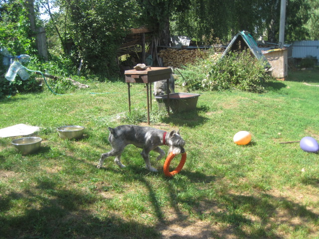 Сначала побежала за мячом и схватила!!)) сфоткать я не успела(((( А потом за колечком бегала.....Тёма-жадина отобрал((( Пока Тося ему сдачи не дала....пока))))