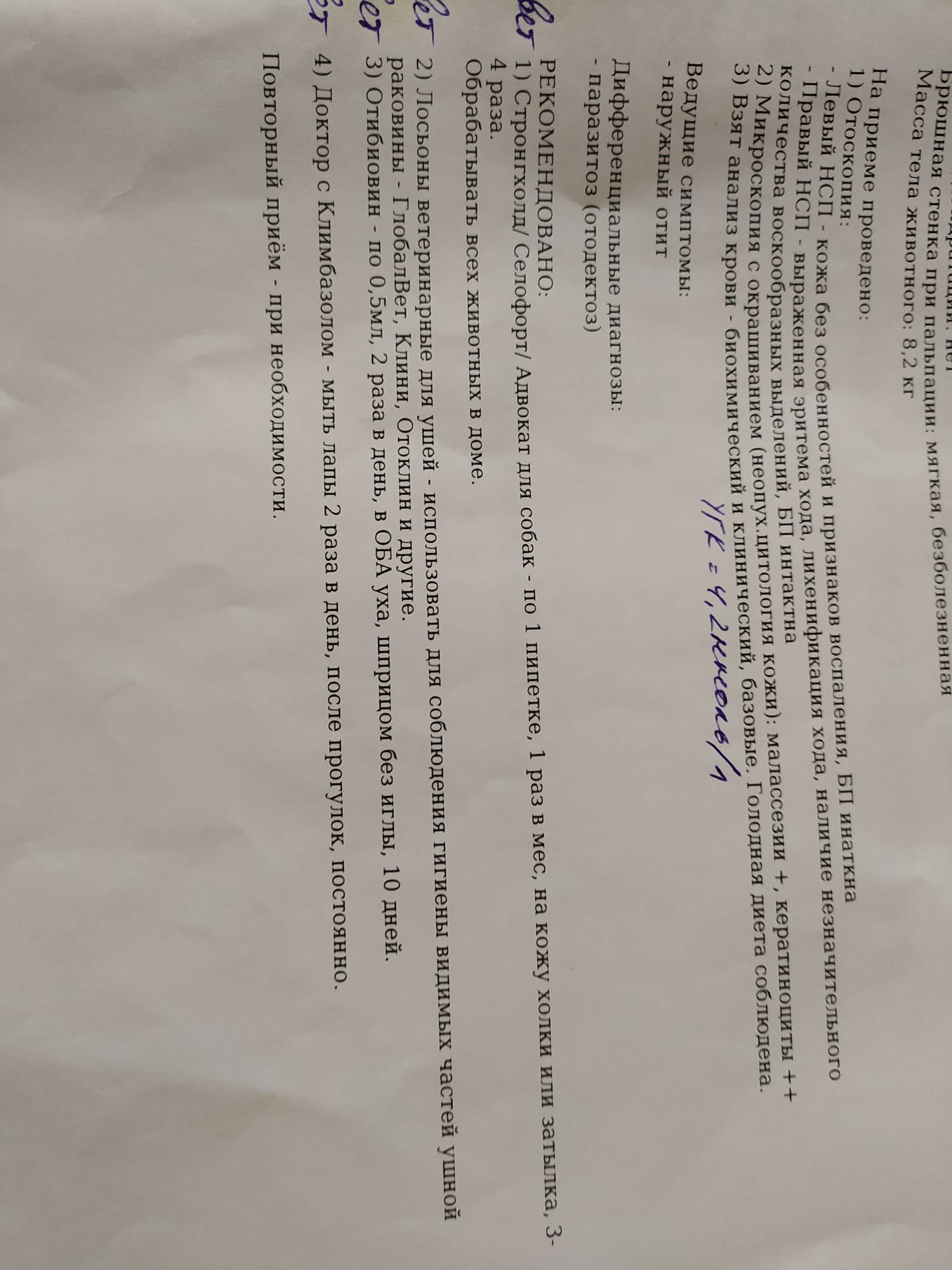 Спасибо, что приютили. От клеща надо обработать повторно 26.08., остальные назначения выполнены. кроме лапы мыть шампунем и уши протирать лосьоном.