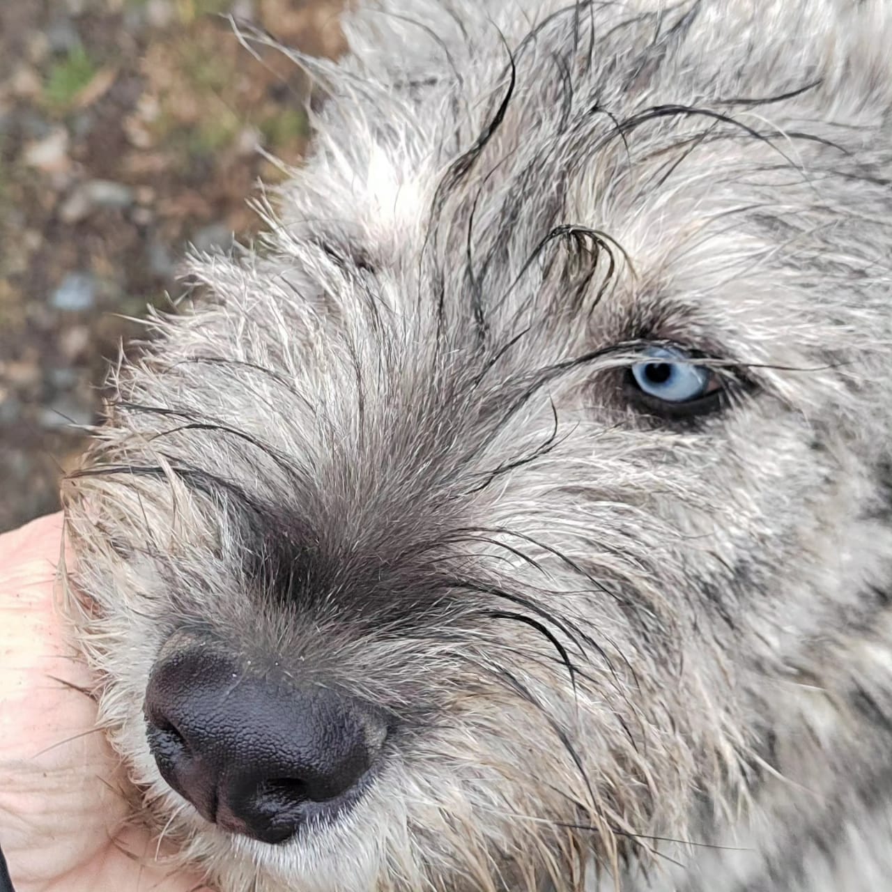 Дома мы сначала погуляли - писает, не поднимая лапу; покакал очень твердым кусочком, со стоном; и жадно глотал снег. Поводка реально не знает, очень удивляется, когда его что-то останавливает и направляет. По виду сзади всё-таки больше напоминает хаски, но подшерстка практически нет, зато есть борода, брови и усы))))