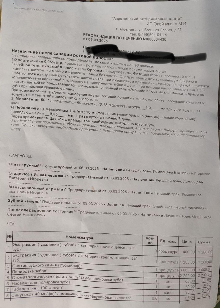 Были сегодня с Юлой у врача. Ушного клеща нет, но есть грибок. Назначили лечение. На зубах налёт, надо чистить и 2 зуба на удаление. Один сгнил, видимо он ей как раз и мешает, а во втором дырка, предположительно от неудачной механической чистки камня. В остальном всё хорошо.
