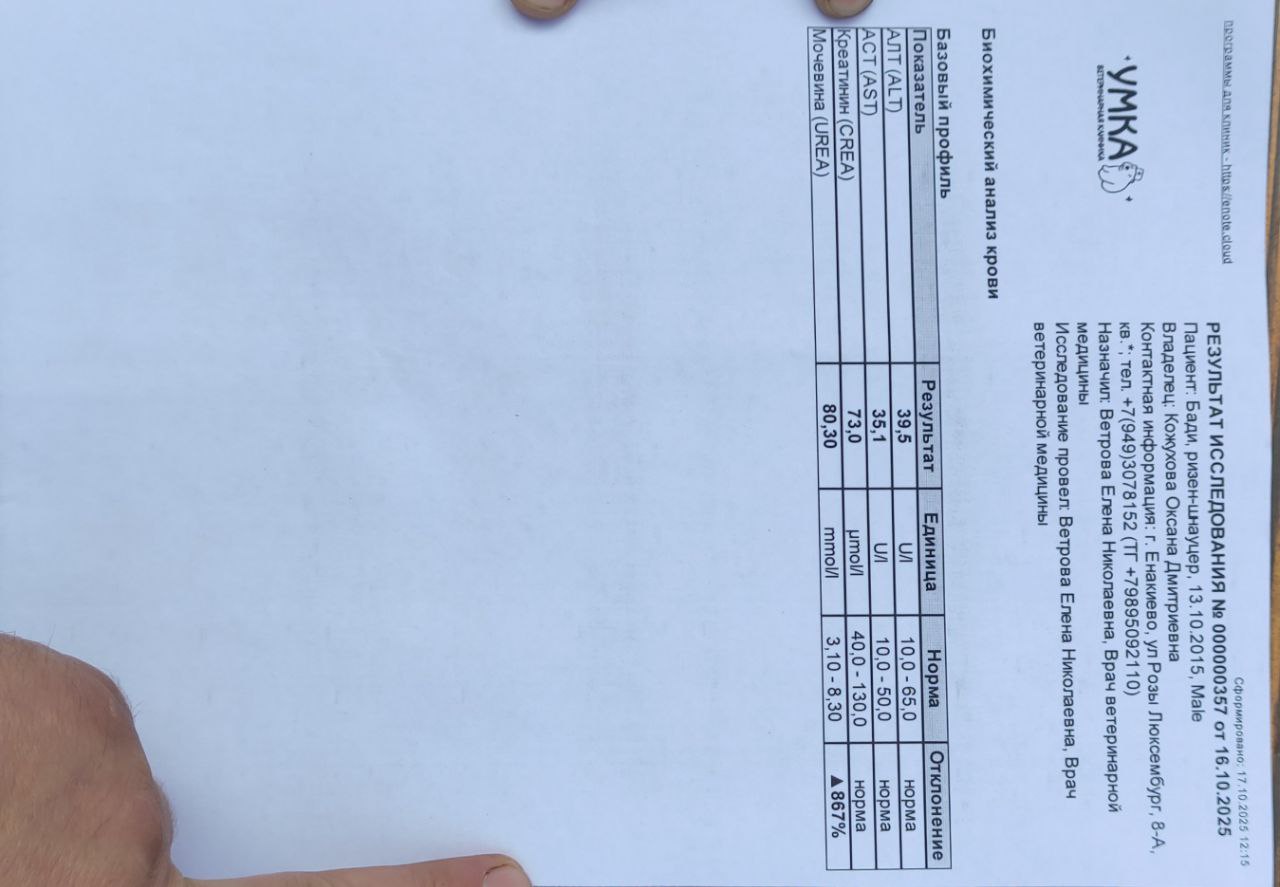 Будем надеяться, что глюк, до пятницы время есть, в случае чего есть возможность перенести на воскресенье операцию...Попадаем на выходные там, это у нас в любой день можно.zver писал(а): ↑17 окт 2025, 15:00 По биохимии очень высокая мочевина - 80.