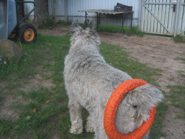 Любимая Тёмина игруха- колечко...точнее два-одно оранжевое, другое фиолетовое. Когда мы уходим гулять, колечки убираю я, а вот когда я ухожу по делам, а собаки заступают на "службу"))) колечки Тёме приходится пристраивать самому....