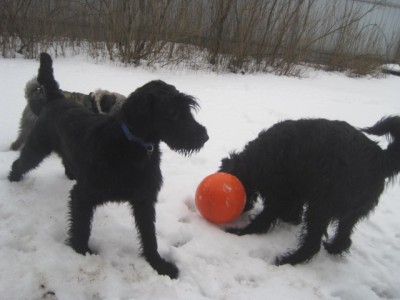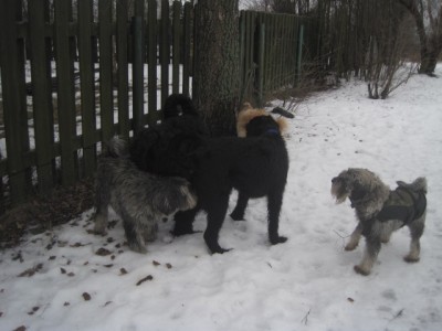 Генка в предвкушении праздника оторвался от морковки ,раскиданной по участку,и стал заинтересованно ждать развязки,тут же подоспел Мухтар и уселся рядом.......Шкипер,не переставая скакать переместился подальше от О.Тяпки.....О.Тяпка...Тёмушка-простофилюшка))он заметил Аришу только когда она уже,перестав выкрадываться рванула в атаку.....Поднимая тучи снежинок,как бешенный внедорожник когда проворачиваются безцельно задние колёса,понеслась.....Эх если бы это была Матушка Зима,всё бы срослось,а то ведь мачеха- не то осень,не то весна- лёд голимый под ногами чуть присыпанный снежком....Арише все таки удалось набрать скорость,но...НО . подскользнувшись и сев на попу(какой позор!!!))) она на этой самой скорости поехала к обалдевшему О.Тяпке...О.Тяпка выронил рогульку и тоже сел на попу .......Ариша доехала до О.Тяпки .....не смогла затормозить и въехала прямо в чёрную пушистость,которая аж всхрюкнула от такого "здрасте" Всё- праздник удался!!Шкипер прибежал поздравить актёров,Генка с Мухой одобрительно помахивали...чем есть...Смутившаяся Ариша попыталась смыться с арены....,но собравшись с духом подбежала таки ко мне за заслуженными поцелуями и обнимашками