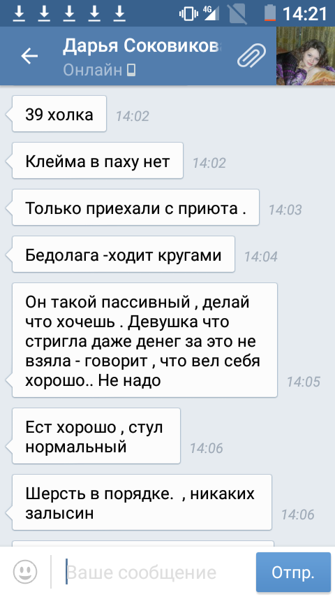 Созвонилась с девушкой. Он сейчас сидит в приюте( 2 дня) в бытовке. Они готовы встретиться и показать.