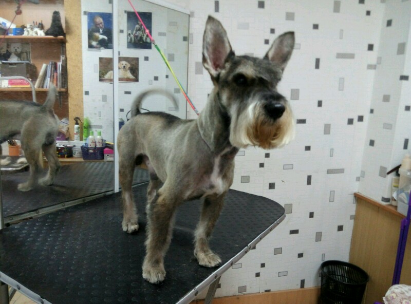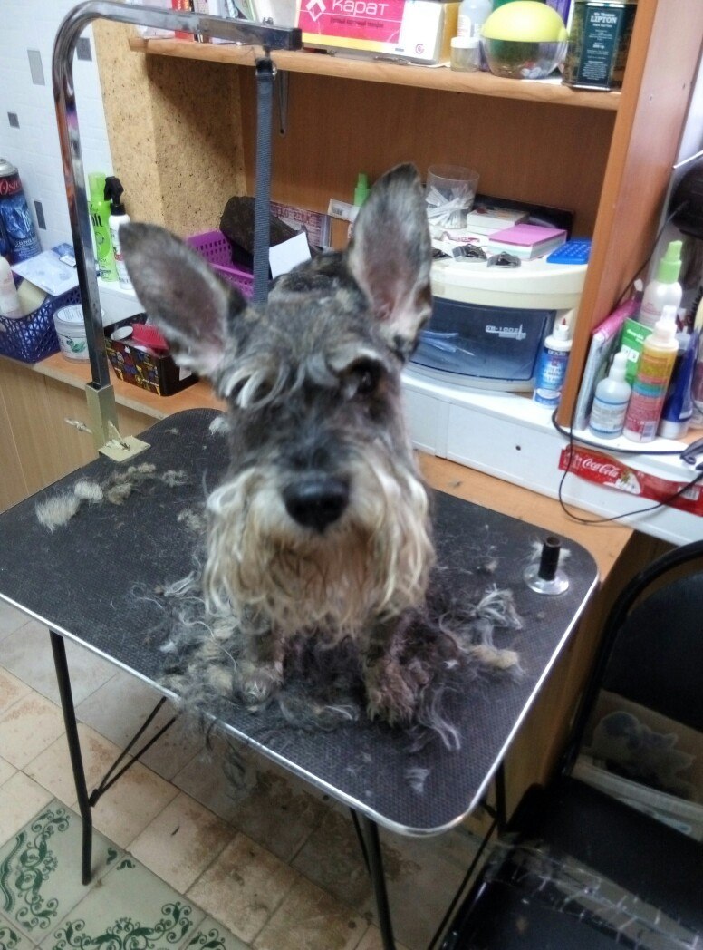 Стригся очень хорошо.Стоял, как статуя. Мастер сказала, что Кузя привык к таким процедурам и психике его позавидуешь. Скорее цверг народного разведения, чипа нет. Вес 9кг, но сказали, что парень очень накаченный( врач дала вердикт), много с ним ходили на прогулках. Возраст 5+. Шерсть хорошая и жёсткая, но щипать не стали