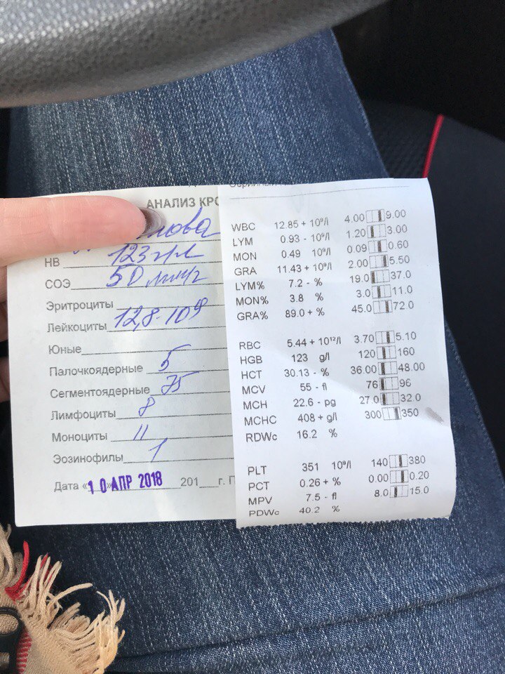 На бланке результаты анализов крови будут завтра. На фото то, что успели записать по телефону.