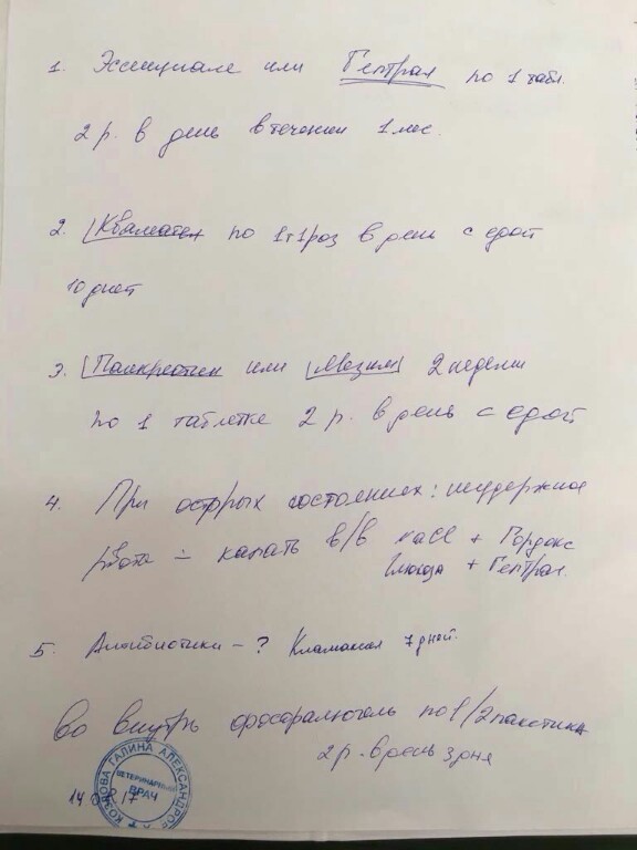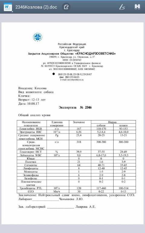 Значит предистория.Жеса отказалась от корма позавчера .Несмотря на это гуляла ,как обычно. Хозяйка гостиницы позвонила мне и врачу ,который обслуживает эту гостиницу. Врач взял анализ крови.Сегодня результат прислали мне на почту .Сам врач будет завтра и будет делать назначения. Вчера Жеса ела хорошо ,сегодня пол-порции. Из того что заметили девочки -служащие и сама хозяйка: Жеса как бы подкашливает ,при этом может отойти некоторое содержимое.