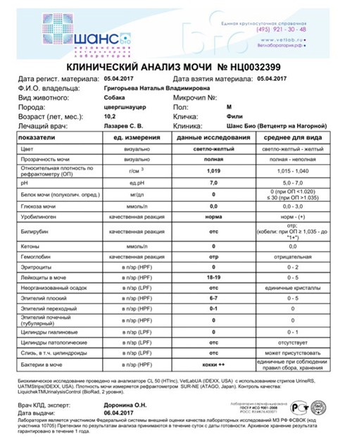 Мария, очень прошу Вас соблюдать правила вежливости и уважать собеседников.CereraNight писал(а):Может уже хватит заниматься самолечением по интернету? Есть врач, который видел и щупал собаку. Он посмотрит анализы и скажет что делать. На коки смотреть при таком сборе как у нас бессмысленно, сбор не стерильный. Эпителия в разы меньше, чем в предыдущем анализе. Лейкоциты "гуляют", но их с большой долей вероятности дает простата.