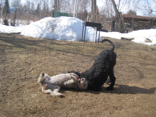 Потеплело. Весна полным ходом, даже ночью тепло))) Небо то ярко-голубое, высоченное , со сверкающим улыбающимся солнцем ,то низкое и серое как в теплице. Ветра, как сорвавшиеся с привязи и почуявшие свободу кони, носятся туда и суда и в разные стороны, срывают ветки с деревьев и снег с крыш, свистят во всех щелях , и заставляют сосулки расти в самых причудливых позах)). А снег…. Ещё пару дней назад ,крепко державший стаю наст, стал ноздрястым, мокрым и предательски рыхлым. Лёд пожелтел как предупреждающий сигнал светофора- опасно!! А река готовясь просыпаться , превратилась в полосу препятствий-то голый мокрый лёд, то рыхлый снег. Но прогулка –дело святое!!! А проказы на прогулке –ещё более святы, ибо где ещё проказничать и отрабатывать приёмы рукопашного боя как не на прогулке))