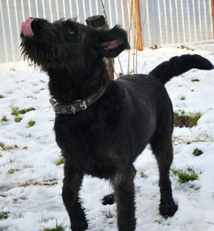 Молой ( ее щен) около 6 мес., будет я,думаю с ризена. Длиннолапый , с оброслостью, хвост длиннее, чем у мамы и тоже саблей. Только уши, меньше размером, чем у наших. Короче так. Нас провели по территории приюта, показали все. Все забито под завязку. Мадам не вытянутая. Не конфликтная. Если малому 6 мес., то она болтыхается около года. По спине шерсть волнистая, уже щипать нужно. Но мохнатость, не такая как у наших. Может и подстригали, т.к. Морда все же не лысая.