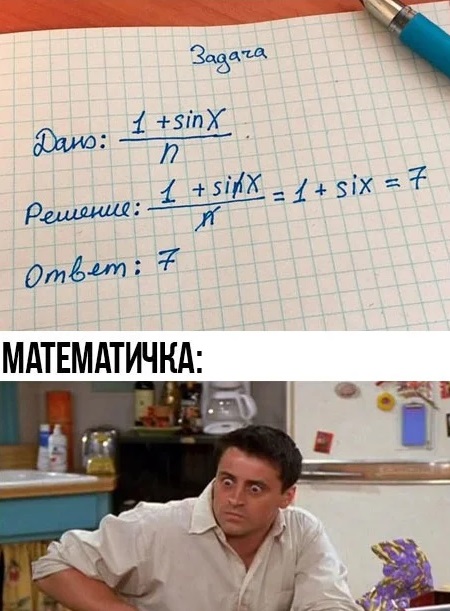 Не просто быть гением, часто приходиться сталкиваться с непониманием со стороны окружающих. Такого креативного и гениального подхода к решению уравнения, явно ни кто не ожидал. не сразу поняла в чём прикол...потом весь вечер плакала.....