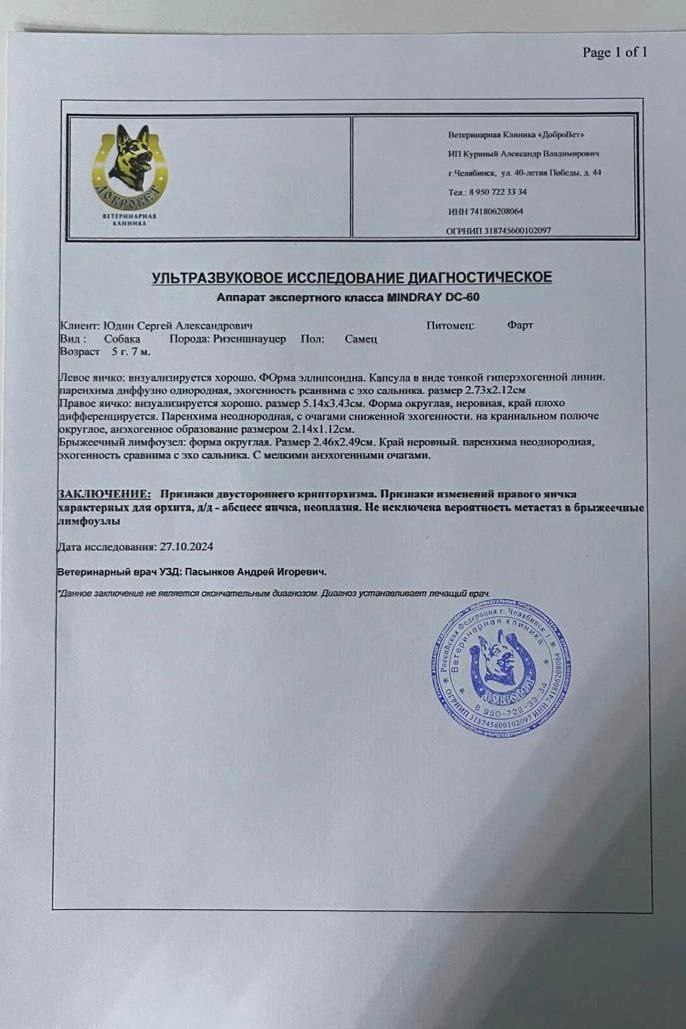 Образование в животе есть, не спаяно ни с чем. Васкуляризация практически отсутствует. Без признаков прорастания. Пальпаторно безболезненное. Еще два образования- предположительно- семенники. Точнее покажет тонкоигольная биопсия. Мезентериальные л/у не изменены, печень и селезенка интактны.