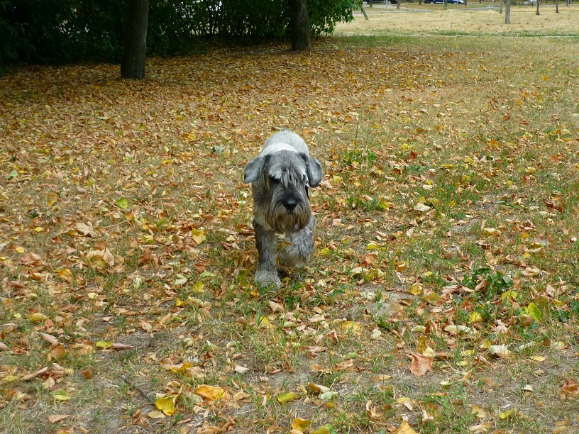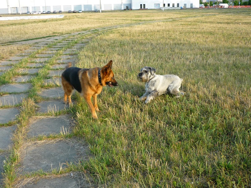 Приехал сын из Витебска, на практику и каникулы, решил взять Янчика сходить в гараж за картошкой... по правде, я не люблю туда ходить, поэтому собакин там никогда не был... все было отлично, пока шли на поводке, как только уже возле гаража спустил с поводка - Янчик развернулся - и домой... никакой реакции ни на команды, ни на вкусняшку... типа, хрен тебя знает, дядька, ты-то наездами бываешь, понимаешь, три дня с нами прожил - а вдруг решил меня отдать кому??? Вот знаменитая шнауцериная самостоятельность и соображалка))) сын дулся на собаку два дня))) А Янчику нравится с ним играться - дома))) правда, уже ходили меня встречать - по знакомому маршруту идет отлично))) вообще, конечно, любит гулять без поводка (кто ж этого не любит), но на команду "поводок" реагирует спокойно, ходит рядом идеально с поводком... обжился среди местных собак, маленьким позволяет все - и лаять на себя, и зубами лязгать, и даже терпит мелкие покусы - просто отходит, а вот с србаками, крупнее себя - лабрадорами, чау-чау - пытается доказать, что он больше и главнее))) хитрый, сначала раззнакомиться, войдет в доверие, а потом права давай качать))) а он-то уже свой, поэтому большие его наезды терпят, от драки уходят. Даже местные коболененависницы - старушка ротвейлерша и ее доча-метиска - приняли его как родственника))) вобщем, подлиза, этакий дипломат - втереться в доверие и возглавить эту банду))) кошек на улице воспринимает как этакий тренажер для бега - подкрасться, напугать, а потом - бежать, часто просто рядом - пока ЭТО на дерево не запрыгнет))) домашнего кота - облизать и покачать лапой))) а если увидел черного кота на улице - это всегда шок - это же наше, домашнее, маааам, ну давай домой заберем)))